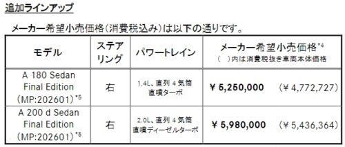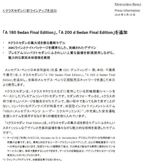 Aクラスセダンは、5月に発売されたファイナルエディションを最後に、生産終了となる。