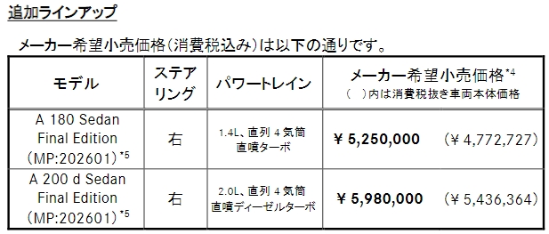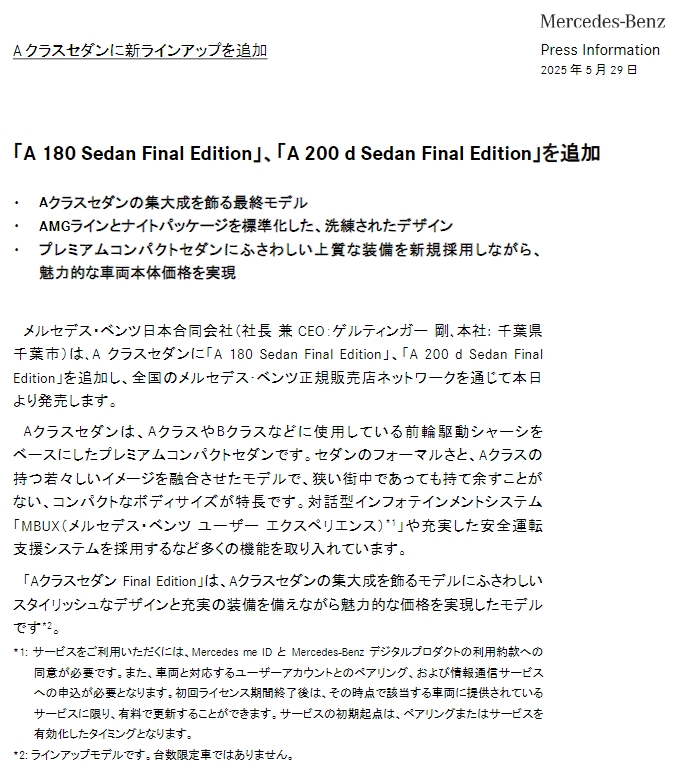 Aクラスセダンは、5月に発売されたファイナルエディションを最後に、生産終了となる。