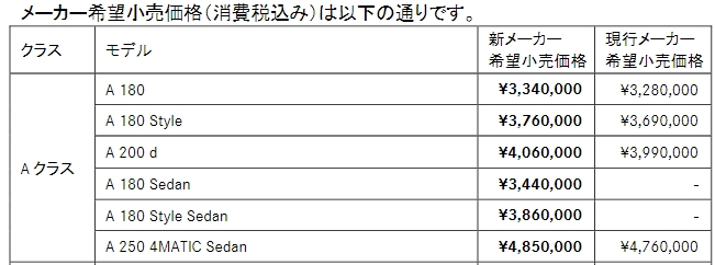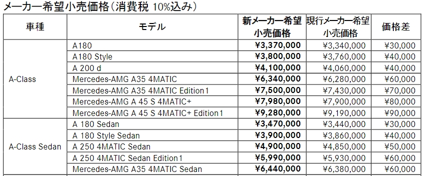 Aクラスセダンの発売からまだ3か月しか経っていない2019年10月、消費税の増税に伴って、さっそく値上げがおこなわれた。(-_-)
